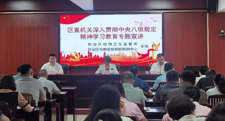 2025年5月15日,区直机关深入贯彻中央八项规定精神学习教育专题宣讲(自治区动物卫生监督所、自治区动物疫病预防控制中心专场)在自治区动物疫病预防控制中心会议室举行。自治区动物卫生监督所和自治区动物疫病预防控制中心两个单位的80多名党员干部聆听了本次宣讲。