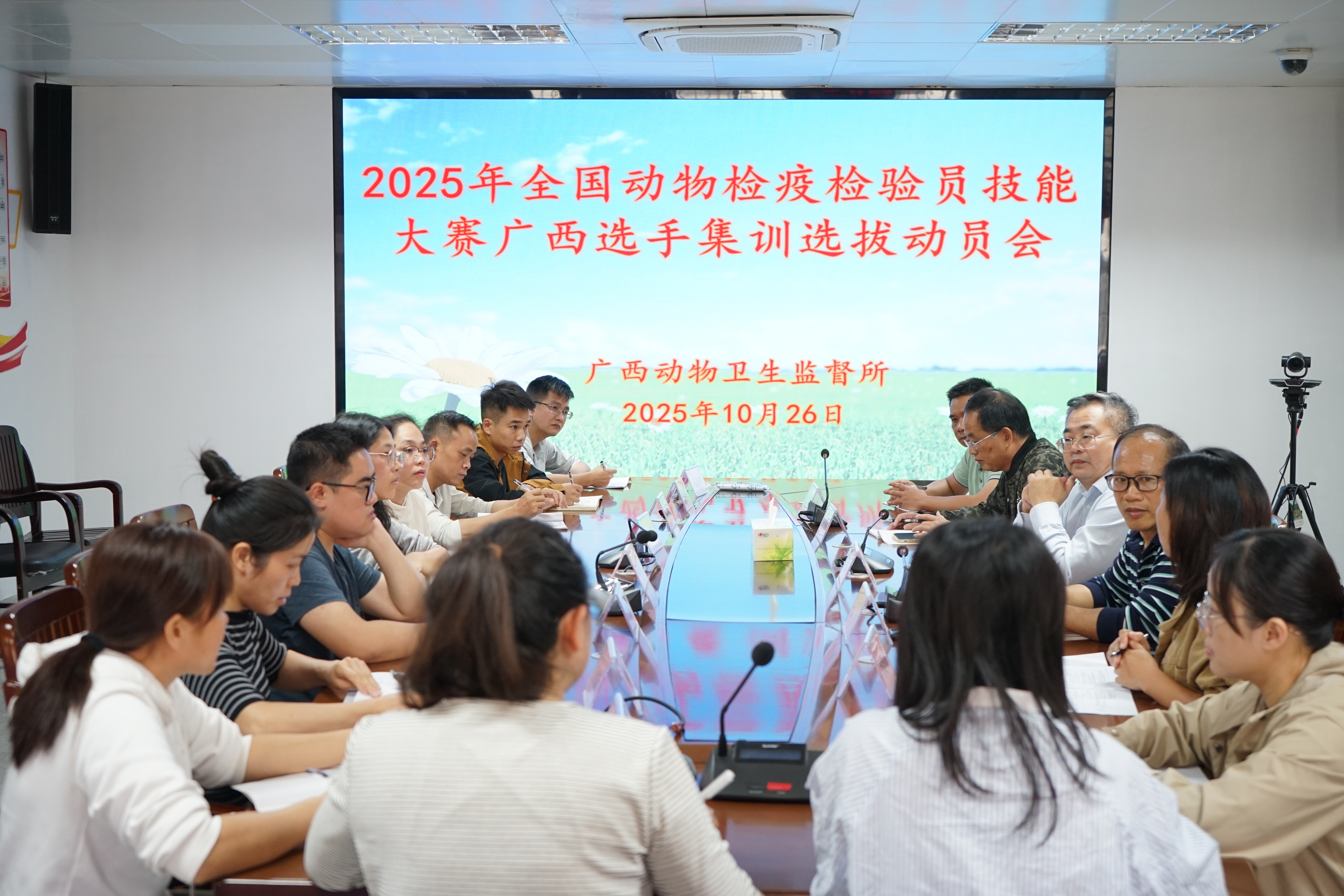 为积极备战2025年全国动物检疫检验员技能大赛,10月26日,自治区动物卫生监督所组织召开了2025年全国动物检疫检验员技能大赛广西选手集训选拔动员会,召集了在全区大赛中成绩优秀的8名选手和邀请了2名指导老师,以及自治区动物卫生监督所有关领导和业务主管科室人员共计18人参加了会议。