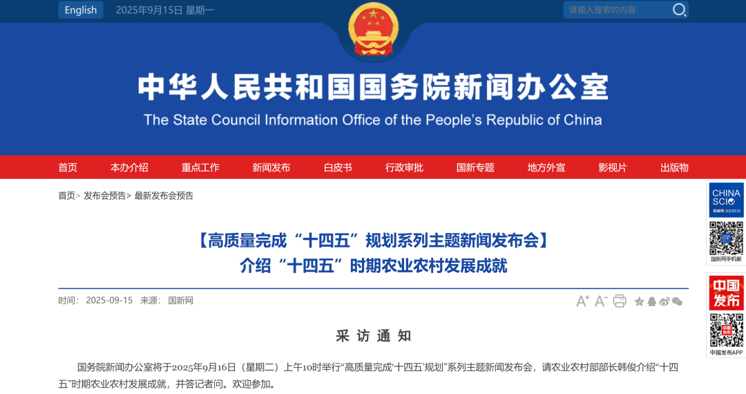 国务院新闻办公室将于2025年9月16日(星期二)上午10时举行“高质量完成‘十四五’规划”系列主题新闻发布会,请农业农村部部长韩俊介绍“十四五”时期农业农村发展成就,并答记者问。