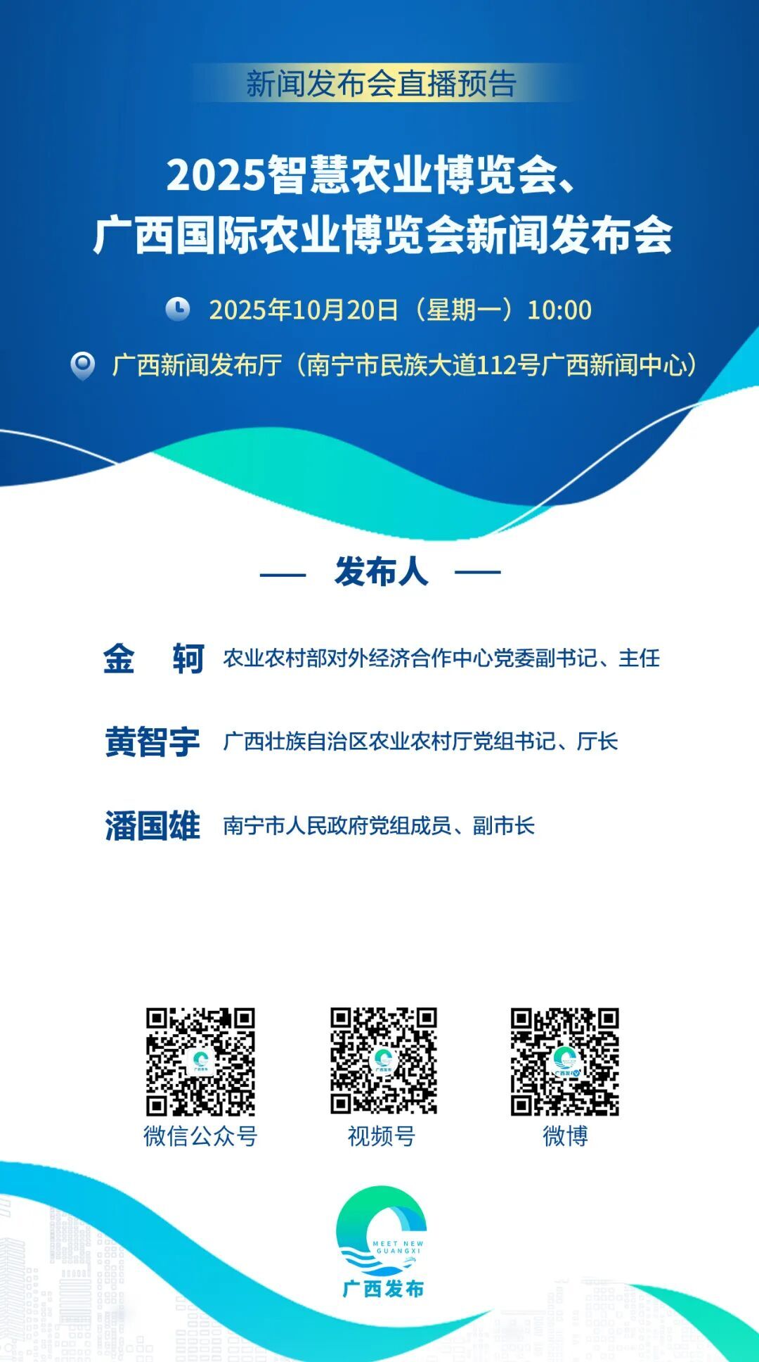 广西壮族自治区人民政府新闻办公室将于2025年10月20日(星期一)10:00,在广西新闻发布厅举行2025智慧农业博览会、广西国际农业博览会新闻发布会,邀请农业农村部对外经济合作中心党委副书记、主任金轲;老王论坛 党组书记、厅长黄智宇;南宁市人民政府党组成员、副市长潘国雄,介绍2025智慧农业博览会、广西国际农业博览会相关情况并回答记者提问。