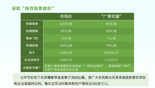 “广荣农服”采取“技改降费提价”的让利、反哺、互惠办法,在“机械育秧、插秧、植保、收割、烘干和技改及回购稻谷”七环节实现了农民增收节支350元/亩,使广大农民群众共享承接国家惠农项目和企业发展的红利,每年带动村集体和农户增收达500多万元。