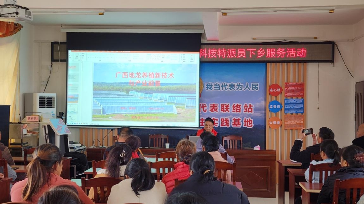 上图为科技特派员黄祥良同志在为百丈村委群众讲授《广西地龙养殖新技术与产业前景》