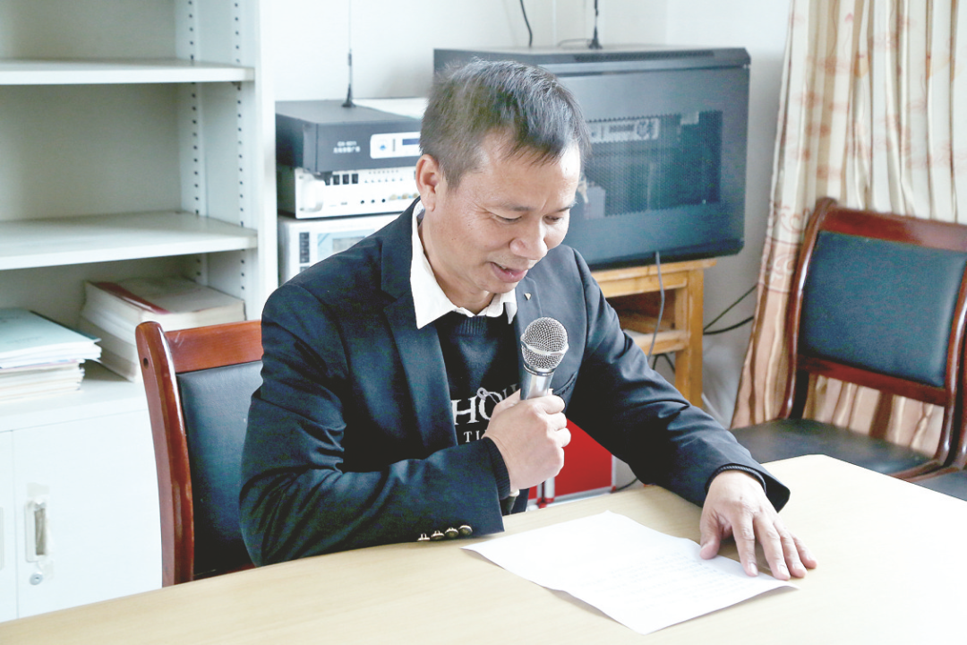 青秀区刘圩镇槐里村党总支书记、村委会主任李光安进行“三语”广播,宣传移风易俗。(陆小同 摄)