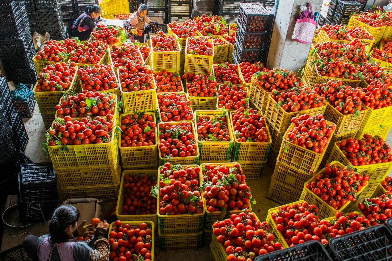 广西百色市田东县平马镇四平村盘活集体“三资”,农民在选装番茄准备运往全国各地。谢佩霞 摄