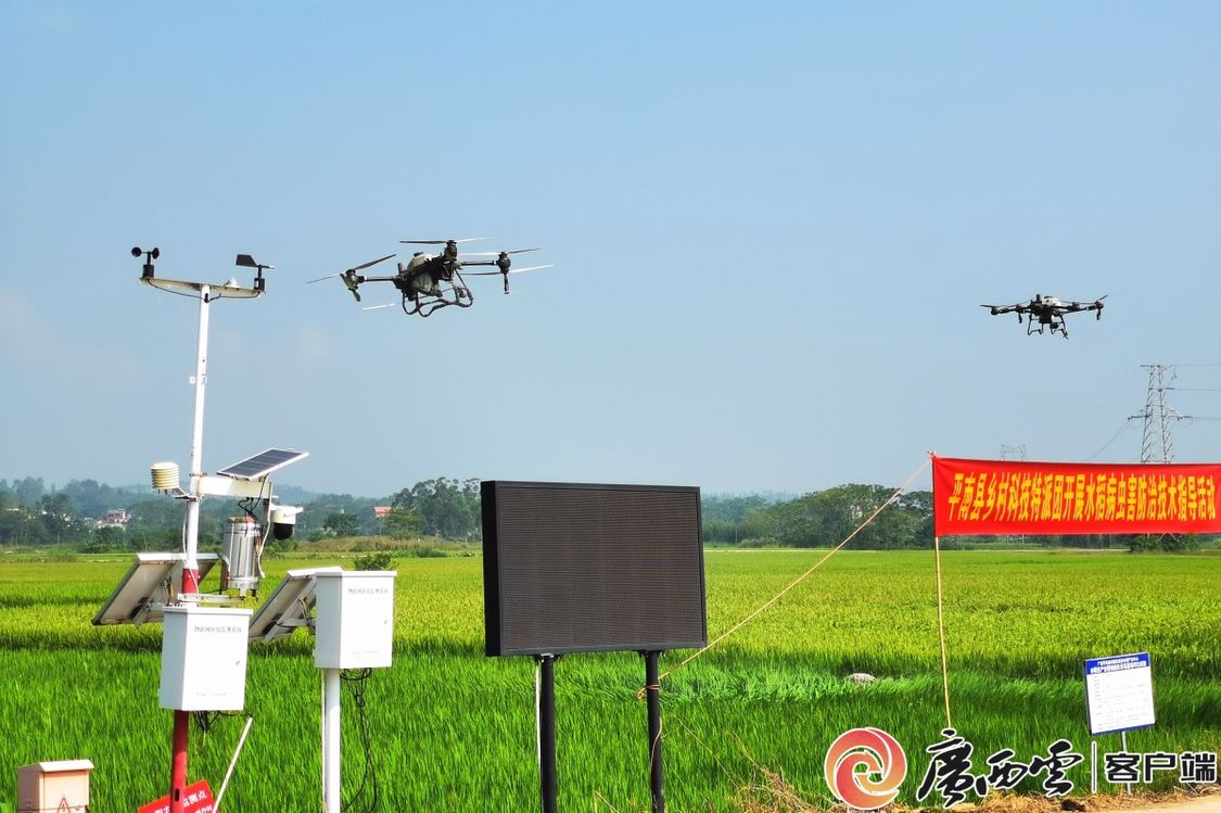 平南县乡村科技特派员利用无人机开展水稻病虫害防治。