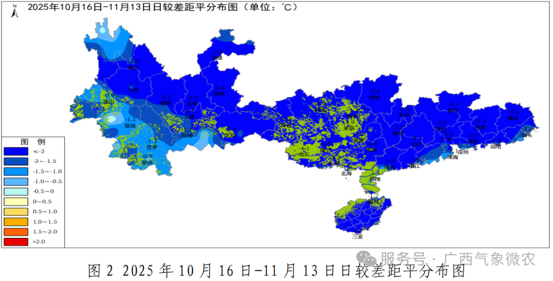 预计广西未来30天(11月15日-12月14日),与常年同期相比,平均气温桂西、桂南偏低0.1~1.0℃,其余地区偏高0.1~1.0℃;降水量桂南偏少1~2成,桂北偏少2~4成。预计后20天主要降水时段出现在:11月27-29日受冷空气影响,全区有分散小雨;12月4-6日受冷空气影响,全区有小雨;12月11-13日受冷空气影响,有小雨。