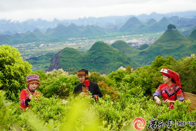 瑶族姑娘在恭城瑶族自治县西岭镇蓝厂茶场采摘春茶制作恭城油茶。通讯员 李茂香 摄